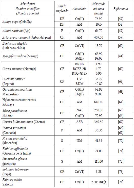 México y aquellos países que cuentan con una enorme biodiversidad de especies vegetales y frutales son atractivos para el establecimiento de industrias alimentarias o agroindustrias, las cuales generan miles de toneladas de residuos vegetales o frutales por año 44y45. Por ello la utilización de estos residuos, principalmente las cáscaras de las frutas, para la eliminación de los contaminantes presentes en los efluentes acuosos, es un alternativa de gran potencial y de aprovechamiento que presenta diversas ventajas como ser materiales bioadsorbentes de bajo costo, disponibilidad, adecuada capacidad de adsorción, factibilidad de mejorar a través de modificación química, susceptible a la regeneración, degradabilidad lo que conduce a un menor número de problemas en la disposición final posterior a la adsorción 42,46,47,48,49.