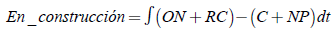 La ecuación 1 representa la variable de nivel en construcción que corresponde a las construcciones activas en un período específico. Este nivel, expresado en metros cuadrados, aumenta con la entrada de obras nuevas (ON) y de obras que reinician actividades (RC) y disminuye con las obras que son culminadas (C) y las nuevas obras paralizadas (NP).