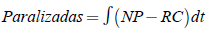 (1)La variable de nivel Paralizadas, ecuación 2, refleja la cantidad de obras (en metros cuadrados) que no presentan actividad productiva durante un período de tiempo. Este nivel aumenta con las nuevas obras paralizadas (NP) y disminuye con las obras que reinician construcción (RC).