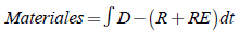 (2)La ecuación 3 define la variable de nivel materiales que representa la acumulación, en toneladas, de los flujos de entrada netos de materiales de construcción; es decir, demanda de materiales del sector de construcción (D) menos materiales reciclados (R) y desechados como residuos de demolición (RE).