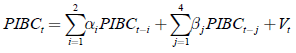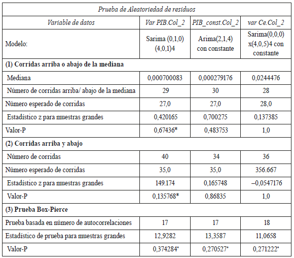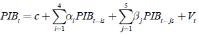 En este estudio se emplean modelos Arima y Sarima porque los datos son trimestrales y tienen variaciones estacionales de cuatro períodos (ver tablas 2 y 3). Para proyectar la variable exógena PIB, la cual influye en el número de obras iniciadas [6], se ajustó un modelo Sarima (0, 1, 0)(4, 0, 5)4 con constante (ecuación 5). De igual manera, se ajustó un modelo Sarima (0, 0, 0)(4, 0, 5)4 con constante para la Variación de Construcciones y edificaciones (ecuación 6). Para el PIB-construcción, se tomó un modelo Arima (2, 1, 4) (ecuación 7). Las proyecciones se hicieron con datos trimestrales entre 2000-I y 2014-III por CAMACOL 16; en la tabla 2 se muestran las pruebas realizadas a los modelos de las ecuaciones 4 a 6. Las ecuaciones de los modelos ajustados son las siguientes: