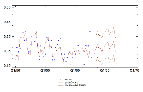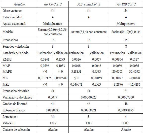 El modelo estacional Sarima (p, d, q) (P, D, Q)s representa tanto las variaciones estacionales de la serie como el componente regular. El componente regular es el primer término, modelo (p, d, q). El segundo término tiene en cuenta los movimientos estacionales, donde P es el número de términos auto-regresivos estacionales SAR, D es el número de diferencias estacionales y Q es el promedio móvil estacional 25; s representa la periodicidad de la serie de tiempo; en este caso s=4 porque las series son trimestrales.