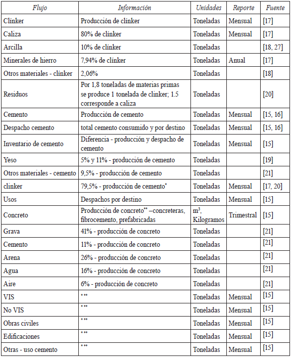 En el diagrama Sankey de la figura 1 se muestran los flujos de materiales de construcción usados en 2013 para la elaboración de clínker, cemento y concreto en Colombia. La información sobre el nivel de producción y de despachos (por destino) del cemento y la preparación de concreto y sus usos se obtuvo del DANE 15 y CAMACOL 16. Por su parte, la producción de caliza, minerales de hierro y clinker se obtuvo de SIMCO 17. Los flujos de los demás materiales se estimaron con base en los estándares fijados por Eurostat 9 y los informes técnicos de EPA 18, la UPME 6 y WBCSD 19, ver tabla 1.
