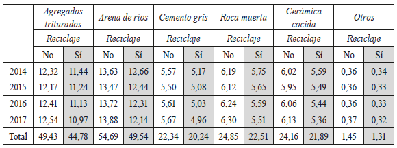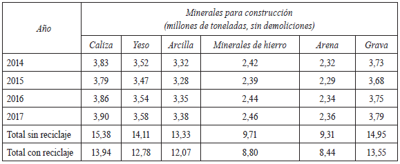 Para estimar la cantidad de materias primas requeridas para fabricar el cemento y concreto demandados por la construcción de viviendas, se usan los flujos de materiales de la figura 1. Como se observa en la tabla 7, entre 2014 y 2017 la fabricación de cemento requeriría aproximadamente 52,54 millones de toneladas de materiales. Estas proyecciones se hacen sin tener en cuenta la oferta secundaria. Sin contar con demoliciones, y asumiendo que la participación de los sistemas constructivos se mantiene como en la tabla 4, entre 2014 y 2017 se necesitarían 9,31 y 14,95 millones de toneladas de arena y grava como insumo para la preparación de concreto.