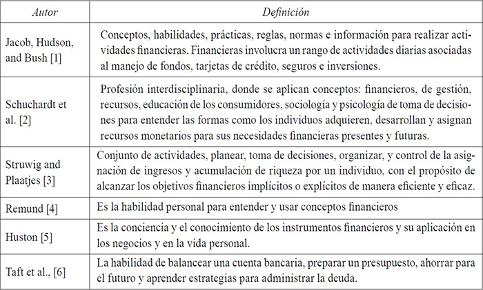 En las definiciones de FP se extraen elementos comunes: conocimientos, conceptos, habilidades, prácticas, reglas, normas, información, conjunto de actividades y conciencia, necesarios para solución de problemas financieros, manejo de productos financieros, adquisición, desarrollo y asignación de recursos monetarios para cubrir las necesidades financieras, toma de decisiones, y acumulación de riqueza. PFP es un conjunto de conceptos requeridos para tomar decisiones financieras. Ver tabla 2.