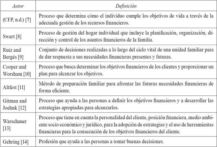 PFP es un conjunto de actividades para definir objetivos y establecer planes de acción que permiten satisfacer necesidades financieras presentes y futuras del individuo. FP refiere al marco requerido en planeación financiera personal como proceso dinámico.