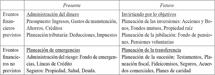 El modelo de PFP propuesto logra los objetivos planteados porque cumple con la integración de los elementos identificados en el estudio de los modelos referenciados. La puesta en práctica del modelo de PFP requiere de un marco de referencia que representa el conjunto de habilidades que fundamentan la ejecución del plan financiero que se defina. Se agruparon y sintetizaron los conceptos en siete áreas de conocimiento, como conceptualización de la PFP, gestión de activos e inversiones, del endeudamiento, del efectivo, del riesgo, tributaria y gestión de la jubilación y sucesión.