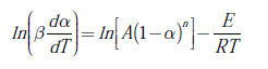 (4)El método Friedman se evalúa empleando la ecuación (5)[13], donde A y n representan el factor de frecuencia y el orden de reacción, respectivamente. Al igual que en el método de Starink, aquí se fijan diferentes valores de conversión y al graficar ln(β(dα / dT)) versus 1 / T se obtiene la pendiente, que corresponde a la energía de activación.