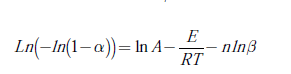 (2)El método de Starink argumenta que las expresiones de aproximación del método FWO y del método KAS pueden ser transformadas en la misma fórmula general, la cual es descrita como se muestra en la ecuación (3), donde β es la velocidad de calentamiento (β = dα / dT); T es la temperatura en K; E es la energía de activación, y R es la constantes de los gases (8,315 J/mol K) [12]. Este método se diferencia de los métodos FWO y KAS por calcular, con mayor precisión, los valores de la energía de activación [4].