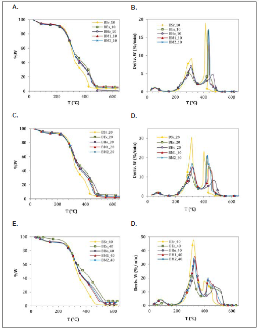 Si se compara los perfiles DTG a 20 °C/min de las briquetas, se puede observar que la temperatura a la que inicia la desvolatilización es similar en todas las muestras (156 - 165 °C). Sin embargo, la temperatura final de la combustión del carbonizado (región de reacción II) varía de 487 a 537 °C, valores que corresponden a las BSr y BHo, respectivamente. Estos resultados indican que el tiempo de residencia de las BHo es mayor que el resto de briquetas en el proceso de combustión; por tanto, este tipo de briqueta requiere más tiempo para entregar la energía que contiene.