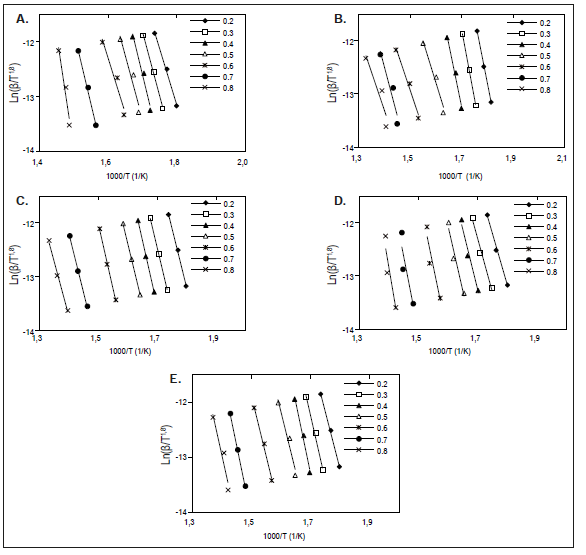 Con los resultados del análisis termogravimétrico de las briquetas se determina la energía de activación siguiendo los métodos Starink y Friedman, y el orden de reacción, por medio de la metodología de Avrami. En las figuras 2 y 3 se presentan las líneas de regresión (con coeficientes de regresión lineal cercanos a la unidad) calculadas a cada una de las briquetas, empleando los métodos Starink y Friedman, respectivamente, para valores de conversión fijos entre 0,2 y 0,8.