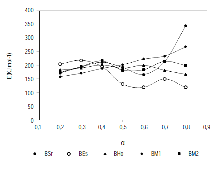A partir de las figuras 2 y 3, y las ecuaciones (3) y (5), se determina la energía de activación para cada método, y se evalúa la variación de la energía de activación con la conversión, como se muestra en las figuras 4 y 5.