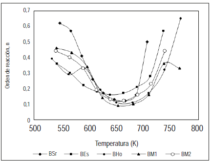 Los resultados de la regresión lineal de la metodología de Avrami se muestran en la figura 6, donde se evalúa la dependencia del orden de reacción con la temperatura, empleando siete niveles de temperatura a tres velocidades de calentamiento. En la figura se observa que en cada una de las briquetas, el orden de reacción presenta diferentes valores respecto a los niveles de temperatura evaluados. Estos valores, siguen una tendencia similar a medida que aumenta la temperatura de reacción. Dicho comportamiento también es reportados por Gai et al. (2013)[4] y muestra que, aunque los mecanismos de reacción de la combustión no son iguales en las diferentes briquetas, sí tienen un comportamiento similar, sobre todo en un rango de temperatura de 600 a 700 °C.