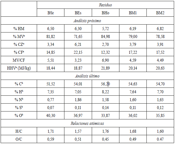 En los resultados del HHV, mostrados en la tabla 1, las BHo (21,89 MJ/kg) reportan el mayor contenido energético, seguidas por la BM1 (20,15 MJ/kg) y BM2 (20,63 MJ/ kg). El mayor HHV en las BHo es congruente con los datos del análisis último, debido a que estas briquetas tienen el mayor porcentaje de C y H, y menor contenido de O, respecto a las otras muestras. Lo anterior significa que en su estructura se encuentra un mayor número de enlaces C-H, los cuales liberan más energía que los C-O, cuando son sometidos a combustión. La relación entre el HHV y el análisis último también se observa en las BSr y BEs, las cuales tienen menor concentración de C y mayor contenido de O, respecto a las demás briquetas, indicando que el HHV es menor.