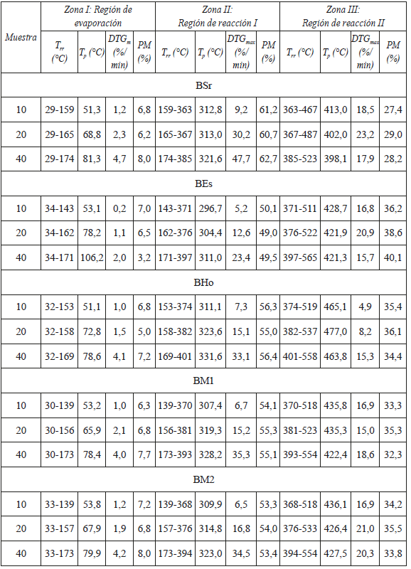 Con la finalidad de entender mejor el comportamiento en la degradación térmica a la combustión de las briquetas se construye la tabla 2 que reúne los parámetros: temperatura de la región de reacción (Trr), temperatura pico donde se tiene la máxima velocidad de pérdida de peso (Tp), velocidad máxima de pérdida de peso (DTGmax) y pérdida de masa total (PM). En esta tabla se observa que Trr aumentan al incrementar la velocidad de calentamiento. En la primera y segunda zonas, los parámetros Tp y DTGmax, incrementan su valor al aumentar la velocidad de calentamiento. Sin embargo, la tercera zona no presenta una tendencia clara en estos parámetros.