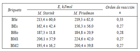 En la tabla 3 se presenta la energía de activación promedio determinada por los métodos Starink y Friedman, y el orden de reacción para cada una de las briquetas. En esta tabla se observa que los valores de energía de activación por los dos métodos son ligeramente cercanos, pero al comparar las desviaciones estándar de cada residuo, se encentra que son menores en el método de Starink. Esto confirma el hecho que el método Starink presenta mayor precisión en los valores de energía de activación comparado con otros métodos [4].