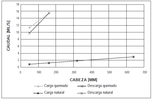 Por otro lado, el suelo quemado no alcanza cabezas superiores a 160 mm y presenta caudales mayores que el suelo natural; esto se corrobora con la MEB y en el ensayo de succión, donde se observa una estructura más abierta y, por tanto, mayor espacio para la fluencia del agua en el suelo sometido a ignición [37]. De igual forma en el suelo quemado se genera una mayor diferencia entre el caudal de la carga y la descarga, clasificando el material como potencialmente erodable. La literatura registra cómo tras los incendios se ha detectado una reducción de la estabilidad de los agregados, relacionada con la pérdida de materia orgánica o con las características intrínsecas del suelo como es su composición textural [2], aumentando el grado de susceptibilidad delos suelos a la erosión hídrica y eólica [9].