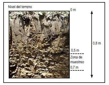 De la zona de estudio se extrajeron muestras a una profundidad entre 0,5 y 0,7 m, como se presenta en la figura 2. Las muestras extraídas fueron del tipo inalteradas (tubos shelby y bloques) y remoldeadas (bolsas plásticas), y corresponden al flujo de lodos descrito anteriormente. Con el material alterado se realizaron ensayos de determinación del contenido de humedad, límites de Atterberg, gravedad específica, granulometría por mallas e hidrómetro, determinación de pH (H2O y KCl), capacidad de intercambio catiónico (CIC), miniatura compactada tropical-rápida (MCT) y difracción de rayos X. Con las muestras inalteradas se efectuaron ensayos de microscopía electrónica de barrido (MEB), succión por el método del papel filtro, desagregación y pinhole test.
