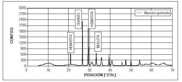 Adicionalmente, se observó que, al someter el suelo a altas temperaturas, se presentaron cambios en la mineralogía, tal como se ve en las figuras 8 y 9. Dichos cambios consisten en la transformación de los minerales existentes. En estas figuras se ve que la muestra quemada presentó hematita, cuarzo y mullita.