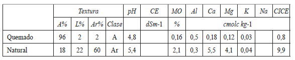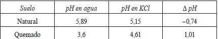 Con relación al pH del material, la mayoría de las investigaciones coinciden en que el pH del suelo aumenta después de las quemas, pero en este caso disminuyó, mostrando como ocurrió en los estudios posteriores al año 2002, que el pH del suelo disminuye el primer mes, y aumenta poco tiempo después (tabla 3) [32]. Con la disminución del pH se pasa de un suelo moderadamente ácido a extremadamente ácido por efecto de la temperatura.