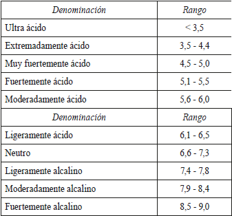Para establecer si existe una variación en la acidez o alcalinidad y definir también el predominio en el nivel mineralógico del suelo estudiado antes y después de la ignición, se debe determinar el pH del suelo. Para ello, se realiza la prueba correspondiente a la Norma ASTM [22] en agua y en solución de cloruro de potasio (KCl); la diferencia entre estos dos valores (ΔpH), en el caso de ser positiva, indica predominio de oxihidróxidos de hierro y aluminio; por el contrario, si este valor es negativo indica prevalencia de arcillominerales [23]. La alcalinidad del suelo se clasifica según los rangos de la tabla 1, a partir del pH en agua.