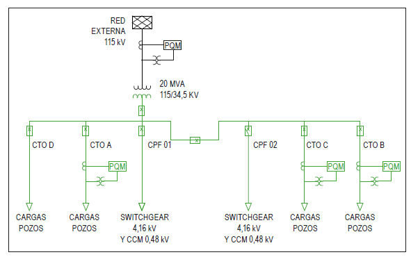 En esta sección se presentan los resultados de la evaluación de la calidad de potencia, siguiendo la metodología presentada en la sección anterior. Como caso de estudio se tiene un sistema que se alimenta a través de la red externa en 115 kV, la cual alimenta 5 circuitos en 34,5 kV a través del transformador principal de la industria (CPF 02 es respaldo del 01). El sistema es radial y, adicionalmente, cuenta con barrajes en 4,16 kV y 480 V. La medición multipunto se realiza en 115 kV y 34,5 kV, con el fin, no solo de identificar los fenómenos, sino de tratar de establecer su origen. La figura 1 muestra el diagrama unifilar general con la ubicación de los medidores disponibles para el estudio. No fue posible obtener las mediciones de los circuitos D y CPF01 debido a fallas en los equipos de registro.