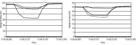 De acuerdo con el análisis previo, se estableció que el hundimiento evaluado se originó en la red externa debido a una falla ocurrida en 2 fases. Esta falla se simuló y los resultados se observan en la figura 4. Esto se logró ajustando la impedancia de falla en la red externa hasta obtener valores similares a los registrados. El evento simulado presenta una diferencia en magnitud respecto al registro real de 2% en 115 kV y de 0,3% en 34,5 kV. Mediante simulación fue posible confirmar que el evento se produjo en la red externa y que afectó dos fases.