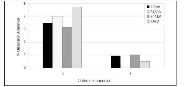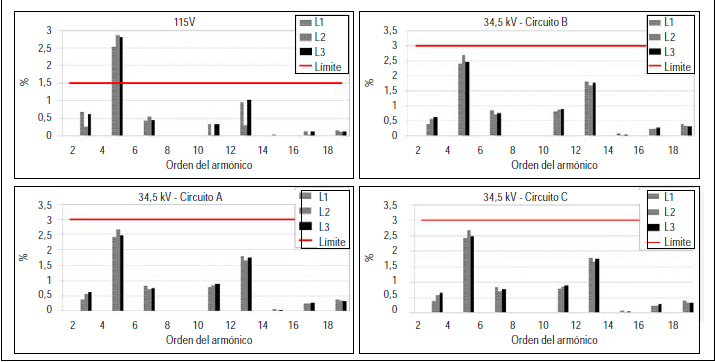 Como se puede apreciar en la figura 3, los niveles de distorsión armónica individual de tensión (Dv) existentes en los circuitos de 34,5 kV (industria) son inferiores al límite establecido por la norma de evaluación (3% para 1 kV < Vn ≤ 69 kV, 1,5% para 69 kV < Vn ≤ 161 kV). En cuanto al circuito alimentador de 115 kV, superó el límite máximo de Dv establecido para este nivel de tensión en el quinto armónico. Igualmente, la distorsión armónica total de tensión (THDv) superó el límite permitido en la red externa (2,5% en 115 kV).
