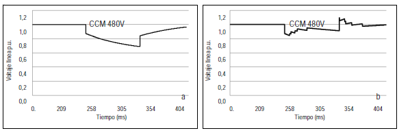 Se definió que el dispositivo se localizaría en 480 V, donde se encuentran los equipos más sensibles ante hundimientos. El dispositivo se diseñó en un caso crítico de falla trifásica para compensar caídas de magnitud 0,7 p.u., debido a que al reproducir los eventos que se presentaron en alta tensión, se encontró en el simulador que esta sería la magnitud mínima en 480 V. El TSC se diseñó para ser implementado en 5 etapas de 3 MVAr, con el fin de mejorar su respuesta dinámica [14,16], dado que no todos los hundimientos tendrán la misma profundidad. Los resultados de simulación en 480 V, antes y después de la implementación del TSC, se muestran en la tabla 2 y la figura 5.
