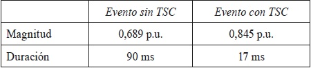 A partir de las simulaciones se pudo comprobar la efectividad del TSC en la disminución de la magnitud del hundimiento en 15,6%, mientras que en duración se redujo en 73 ms.