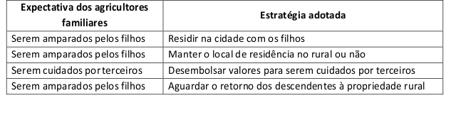 Nas condições empíricas analisadas, os resultados revelaram que parte significativa dos entrevistados espera ou gostaria de ser cuidado pelos filhos na velhice, seja no meio urbano ou na propriedade rural. Uma parcela de agricultores, no entanto, tem dúvidas se os filhos assumirão essa responsabilidade e não sabem como será quando a velhice chegar. Outros entrevistados decidirão essa questão por conta própria, com a justificativa de que os filhos têm suas moradias, suas famílias e o trabalho, não dispondo de tempo para cuidar dos pais.