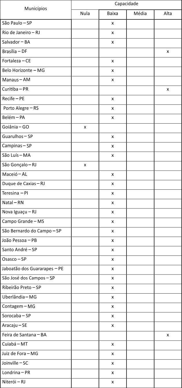 Mesmo tendo a construção dos parâmetros fundamento em estudos anteriores, ressalta-se que o indicador “atendimento parcial”, que representa a capacidade baixa, pode albergar no mesmo descritivo entidades que observam 90% dos requisitos analisados e outras que observam 20%. Ainda assim, optou-se por manter este indicador como representante da capacidade baixa, pois se pressupõe que o atendimento à legislação deve ser o mínimo a ser cumprido, neste caso pelos Legislativos locais. Obviamente que os Legislativos que observam 90% dos requisitos estão mais próximos do atendimento integral à lei, comparados àqueles que observam 20% dos requisitos.