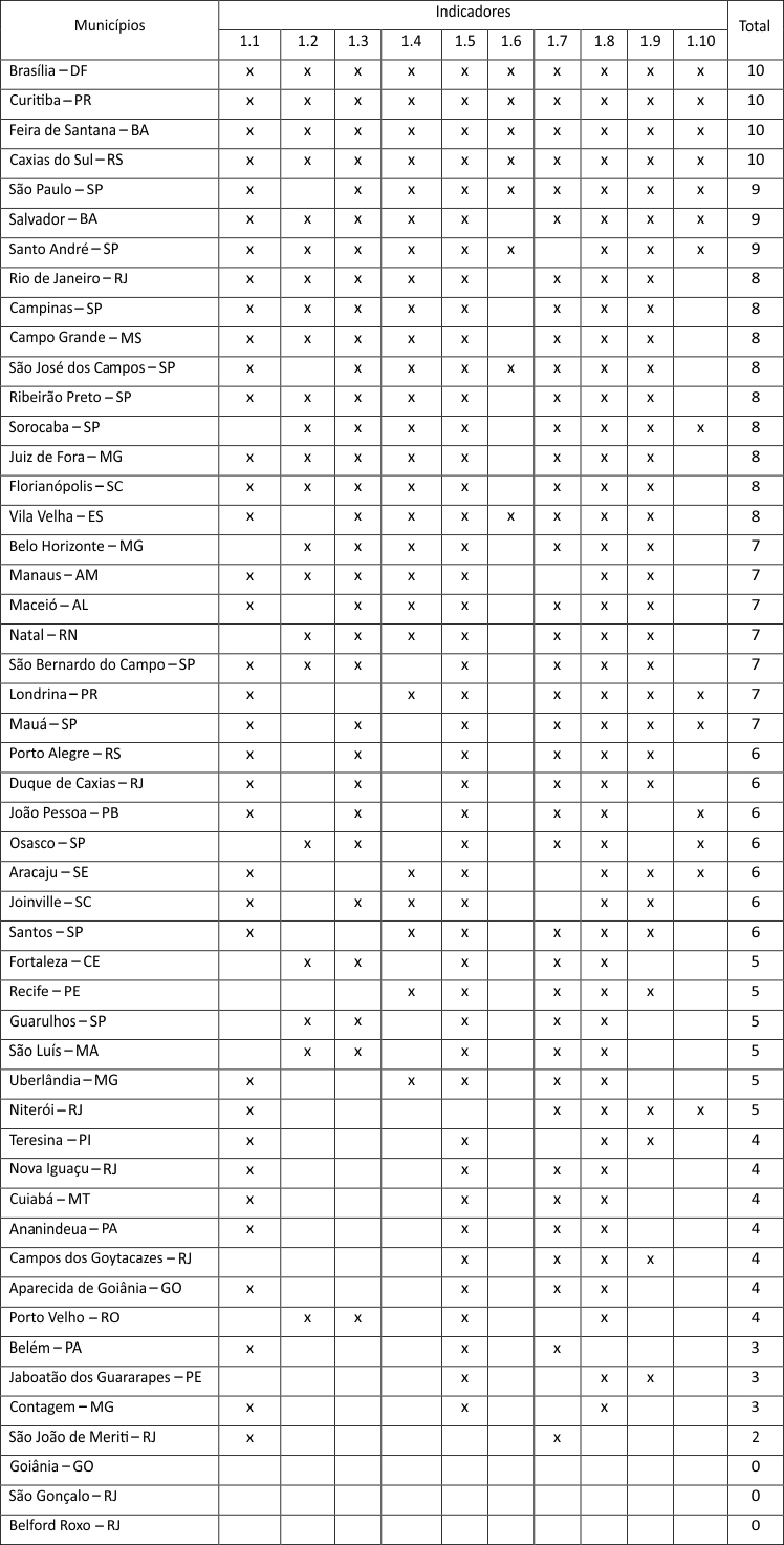 Da mesma forma, procedeu-se à identificação dos indicadores de instrumentos de transparência não restritos às exigências legais nos portais eletrônicos, conforme consta no Apêndice C. Dentro dessa categoria, 9 portais eletrônicos (18%) apresentaram todos os indicadores de instrumentos de transparência não restritos às exigências da LAI: São Paulo (SP), Rio de Janeiro (RJ), Brasília (DF), Fortaleza (CE), Belo Horizonte (MG), Osasco (SP), Juiz de Fora (MG), Londrina (PR) e Santos (SP). Apesar de esses portais apresentarem todos os instrumentos de transparência não restritos às exigências legais, contribuindo para melhorar a qualidade da informação – visibility e inferability – são portais eletrônicos que não cumprem integralmente a legislação, ou seja, apresentam aquilo que era de pressupor que não apresentassem, diante de uma realidade em que muitos Legislativos não apresentam nem mesmo a exigência legal.