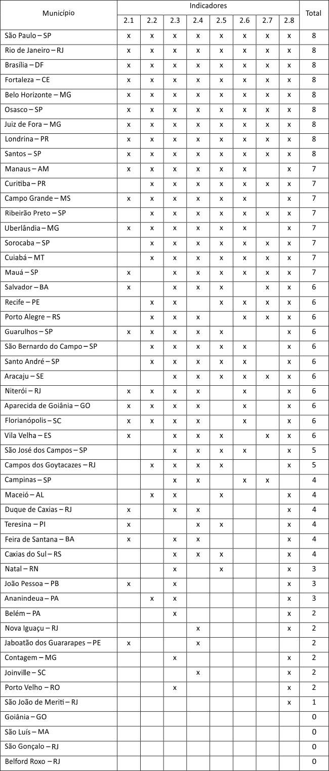 De modo particular, a presença dos indicadores de transparência restritos às exigências legais presentes nos portais eletrônicos pode ser observada no Apêndice B. Dentro dessa categoria de indicadores é expressiva a quantidade de portais eletrônicos que atendem a menos da metade dos indicadores, correspondendo a 14 portais investigados (28%). São os Legislativos de Teresina (PI), Nova Iguaçu (RJ), Cuiabá (MT), Ananindeua (PA), Campos dos Goytacazes (RJ), Aparecida de Goiânia (GO), Porto Velho (RO), Belém (PA), Jaboatão dos Guararapes (PE), Contagem (MG), São João de Meriti (RJ), Goiânia (GO), São Gonçalo (RJ) e Belford Roxo (RJ). Por outro lado, os portais de São Paulo (SP), Salvador (BA) e Santo André (SP) apresentaram 9 dos 10 indicadores de instrumentos de transparência restritos às exigências legais. Medidas simples, portanto, são suficientes para que esses portais atendam integralmente à legislação e passem a configurar uma alta capacidade de transparência.