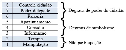 Para utilizar o contexto virtual, porém, há necessidade de se ter um embasamento conceitual em relação à participação. As ideias que Arnstein (1967) denomina “Degraus da Participação Cidadã” (Figura 1), são utilizadas neste estudo com este fim.