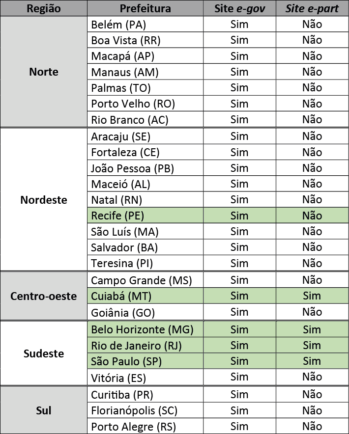 Quando se trata de e-participation, apenas as prefeituras de Belo Horizonte, Cuiabá, Curitiba, Rio de Janeiro e São Paulo apresentaram espaços virtuais com possibilidades de participação popular na gestão a partir do ambiente virtual, ou seja, nenhuma das regiões brasileiras oferece completamente a participação virtual. Destaca-se, todavia, a Região Sudeste, em que apenas a capital Vitória não tem e-participation. Dessa forma, foram identificadas 5 prefeituras que se utilizam do conceito de e-participation em um universo de 26 instituições pesquisadas, o que perfaz um percentual de 19% de instituições que permitem a participação virtual em ambientes especificamente desenvolvidos para tal.