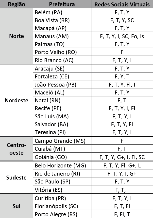 Diante dos objetivos descritos anteriormente, a pesquisa ocorreu nos sites das prefeituras das regiões brasileiras: Norte – Belém (PA), Boa Vista (RR), Macapá (AP), Manaus (AM), Palmas (TO), Porto Velho (RO), Rio Branco (AC); Nordeste – Aracaju (SE), Fortaleza (CE), João Pessoa (PB), Maceió (AL), Natal (RN), Recife (PE), São Luís (MA), Salvador (BA) e Teresina (PI); Centro-Oeste – Campo Grande (MS), Cuiabá (MT) e Goiânia (GO); Sudeste – Belo Horizonte (MG), Rio de Janeiro (RJ), São Paulo (SP) e Vitória (ES), e Sul – Curitiba (PR), Florianópolis (SC), Porto Alegre (RS). A investigação foi realizada entre os dias 2 e 21 de abril de 2015.