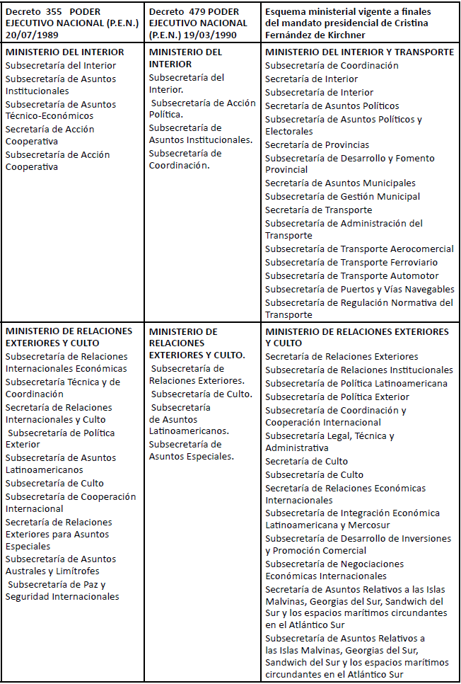 A nivel estructural, en primer lugar, es posible advertir una jibarización del aparato estatal. El esquema ministerial del Estado nacional presentó una reducción de su tamaño en comparación al existente con anterioridad al inicio del proceso de reformas. Las Leyes de Emergencia Económica (Ley N° 23.697) y de Reforma del Estado (Ley N° 23.696) sentaron las bases para esta transformación del Estado en línea a conformar un proyecto estatal neoliberal. Luego de haber transitado varias décadas de intervencionismo estatal en el desenvolvimiento socio-económico – desde mediados del siglo 20 – y habiéndose obtenido resultados limitados en términos de crecimiento económico y desarrollo, numerosos académicos y policy makers locales, influenciados por la creciente hegemonía neoliberal que estaba consolidándose a nivel global, y que se institucionalizaba en el discurso de prestigiosos tanques de pensamiento internacionales (BIERSTEKER,1990; BRENNER; PECK; THEODORE, 2011; COX, 1993), sindicaron como principal causa de los mismos a la ineficiencia del Estado y a los comportamientos rentistas y clientelares que este habilitaba (CAVAROZZI, 1991; FERNÁNDEZ; TEALDO; VILLALBA, 2005; LLACH, 1997). De esta manera, con impulso interno, pero a instancia de los organismos internacionales de tendencia neoliberalizadora – como el BM, BID, FMI –, a través de las precitadas leyes, se propició una reconfiguración del Estado-Nación que justificó su des-implicación de la regulación de la actividad económica, reservándose sólo las prestaciones – no delegadas a las provincias – de servicios públicos esenciales para el desenvolvimiento social (INAP, 1997).