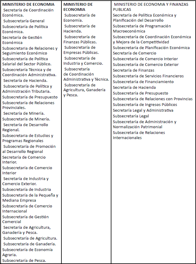 Si analizamos la estructura organizativa del aparato estatal y sus asignaciones presupuestarias podemos dar cuenta de dichas transformaciones. En lo que refiere al organigrama del Estado, se advierte una reducción del número de instancias ministeriales, secretarías y subsecretarías vinculadas a la regulación del sistema económico y a la actividad económica del sector público. Según el Decreto N° 355/89, que establecía la organización de la estructura ministerial con anterioridad a la puesta en marcha del proceso de Reforma del Estado, las instancias centralmente vinculadas a la actividad económica tenían una importancia significativa dentro del aparato estatal. El Ministerio de Economía contaba con 8 Secretarías y 20 Subsecretarías, y el Ministerio de Obras y Servicios Públicos tenía designadas 4 Secretarías y 11 Subsecretarías para cumplir sus funciones, lo que representaba, en conjunto, cerca del 48٪ de las agencias estatales vigentes. Puesto en marcha el precitado proceso de ajuste, ambos Ministerios redujeron drásticamente el número de dependencias con que contaban para desenvolver su actividad; el Ministerio de Economía pasó a tener sólo ٧ Subsecretarias y el Ministerio de Obras y Servicios Públicos 4, con lo cual su participación dentro del total de reparticiones dentro organigrama estatal descendió aproximadamente al 34٪ (ver Anexo I).