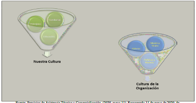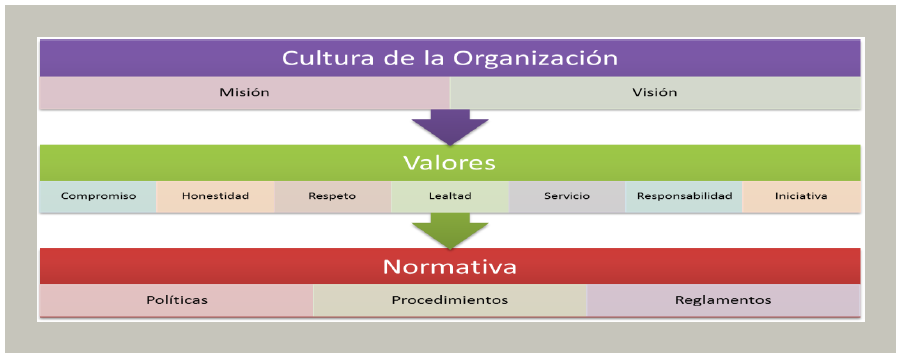 A sí como en el núcleo familiar existen roles (papas, hijos y abuelos) y objetivos en común (sustento, alimento, vestido), todos ellos “trabajando” y siendo “evaluados” en un entorno “controlado” a través de las reglas de familia y de su entorno social; Análogamente en las organizaciones aparecen los mismos “personajes” actuados por un jefe y un equipo de colaboradores diferentes entre sí, buscando alcanzar las metas establecidas por el negocio, actuando, siendo evaluados y teniendo como base la denominada “Cultura Organizacional”, que no son más que los valores éticos, competencias o conductas esperadas, las reglas y normativas empresariales, como se muestra a continuación: