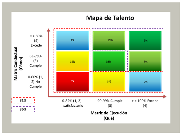 En este ejercicio se observa que la distribución de talento, después de evaluación de 90°, fue de un 31% de colaborador por debajo del desempeño promedio esperado, 34% con un desempeño dentro del promedio y un 36% de colaboradores que se podrían considerar como talentosos o de alto desempeño. Como referencia, y de acuerdo a la curva de distribución normal de este tipo de estudios, los porcentajes son 15%, 65% y 20%, respectivamente.