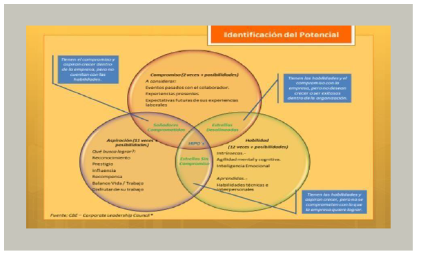En este diagrama se ubican los diferentes niveles de Potencial, refiriéndose a los Altos Potenciales (HIPO´s, por sus siglas en inglés - High Potencial) como aquellos que combinan las tres variables; sin embargo, cuando alguna de las variables no está contenida dentro de la persona, se observan distractores que evitan ese alto potencial.