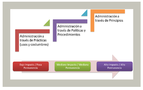 El segundo momento es la etapa en donde la Cultura ha tenido una evolución al reconocer que esos usos y costumbres deben ser formalizados en Políticas y Procedimientos, para dejar de lado la imagen de que “en la empresa se hace lo que el jefe dice”, para ahora disfrazar el hecho con el establecimiento de una “Normativa”.