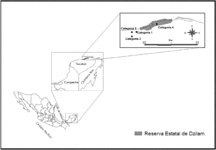 Área de estudio. Cada sitio de muestreo pertenece a una parcela agropecuaria con diferente tiempo de abandono. Categoría 1: menos de 2 años; Categoría 2: entre 2 y 5 años; Categoría 3: entre 5 y 10 años, y Categoría 4: más de 10 años. La vegetación original de la zona es la selva baja caducifolia. El área sombreada muestra el Parque Estatal de Dzilam, Yucatán.