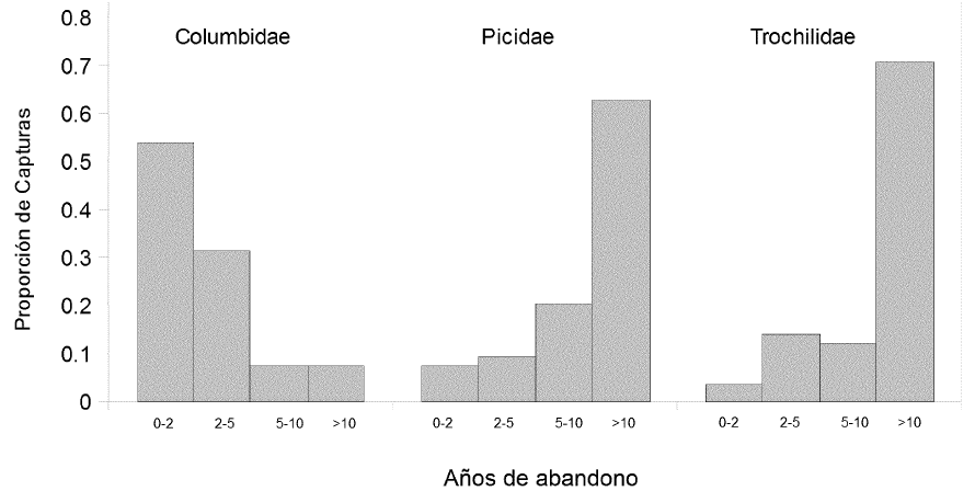 Proporción de individuos de Columbidae, Picidae y Trochilidae capturados en parcelas agropecuarias con diferentes tiempos de abandono en Dzilam, Yucatán, en donde la vegetación histórica original es de selva baja caducifolia.
