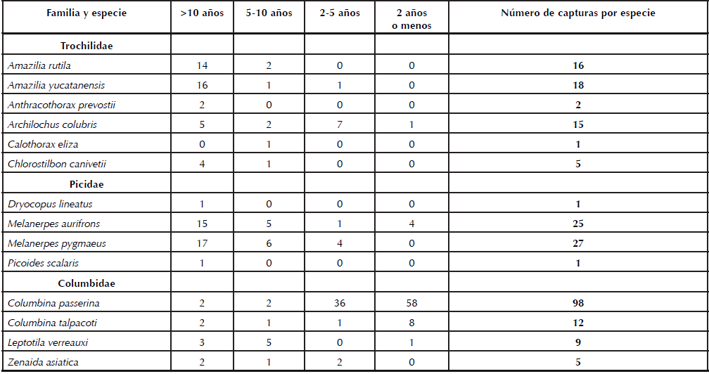 La mayor captura de colibríes en los sitios más antiguos muestran tanto la disponibilidad de flores de las que se alimentan como sus pautas de movimiento, pues son organismos primordialmente nectarívoros (Proctor et al. 1996) que, por su talla pequeña, evitan volar en áreas con vegetación abierta (Hadley y Betts 2009) para reducir el riesgo de ser depredados. Columbina passerina, una especie granívora de la familia Columbidae, demostró una clara preferencia por los sitios con antropización más reciente (parcelas en categorías 1 y 2, Cuadro 2). Esto se debe a que esta especie es un ave que prefiere forrajear en áreas abiertas o con poca cobertura arbórea de zonas pobladas o cultivadas tanto en localidades rurales como urbanas (Howell y Webb 1995, Chablé-Santos et al. 2007, Leirana-Alcocer et al. 2012). En otras regiones neotropicales también se observa que los cultivos recientes tienen gran abundancia de granívoros (Renner et al. 2006) debido a la dominancia en la vegetación de herbáceas y arbustos con una abundante producción de semillas pequeñas.