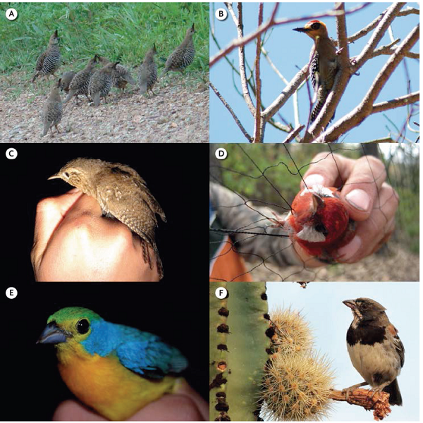 A) Philortyx fasciatus (foto: J. Valle, 2/08/2009), B) Melanerpes chrysogenys (foto: J. Rodríguez, 27/02/2010), C) Thryothorus sinaloa (foto: K. Barragán, 22/03/2010), D) Cardellina rubra (foto: K. Barragán, 22/03/2010), E) Passerina leclancherii (foto: V. Rosas, 8/07/2009) y F) Peucaea humeralis (foto: J. Valle, 22/05/2009).