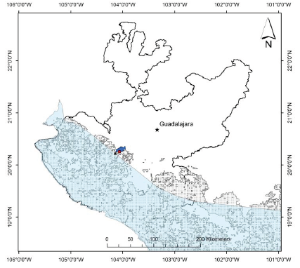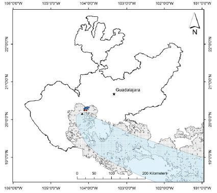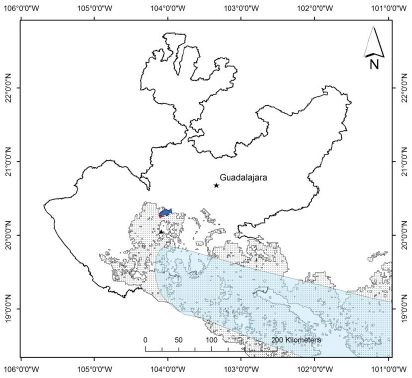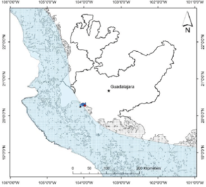 Distribución potencial (área punteada conforme Navarro y Peterson 2007a) y registro (círculo rojo) de Philortyx fasciatus en Sierra de Quila, Jalisco. Los avistamientos más cercanos se muestran con un triángulo negro (BirdLife International 2014a). La distribución con base en IUCN (2014) se muestra con la superficie azul claro. El APFFSQ se muestra con el polígono azul.