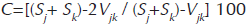 Donde Sj y Sk es el número de especies en los sitios j y k, y Vjk es el número de especies en común en los dos sitios. La complementariedad varía de 0% cuando las listas son idénticas a 100% cuando son completamente distintas.