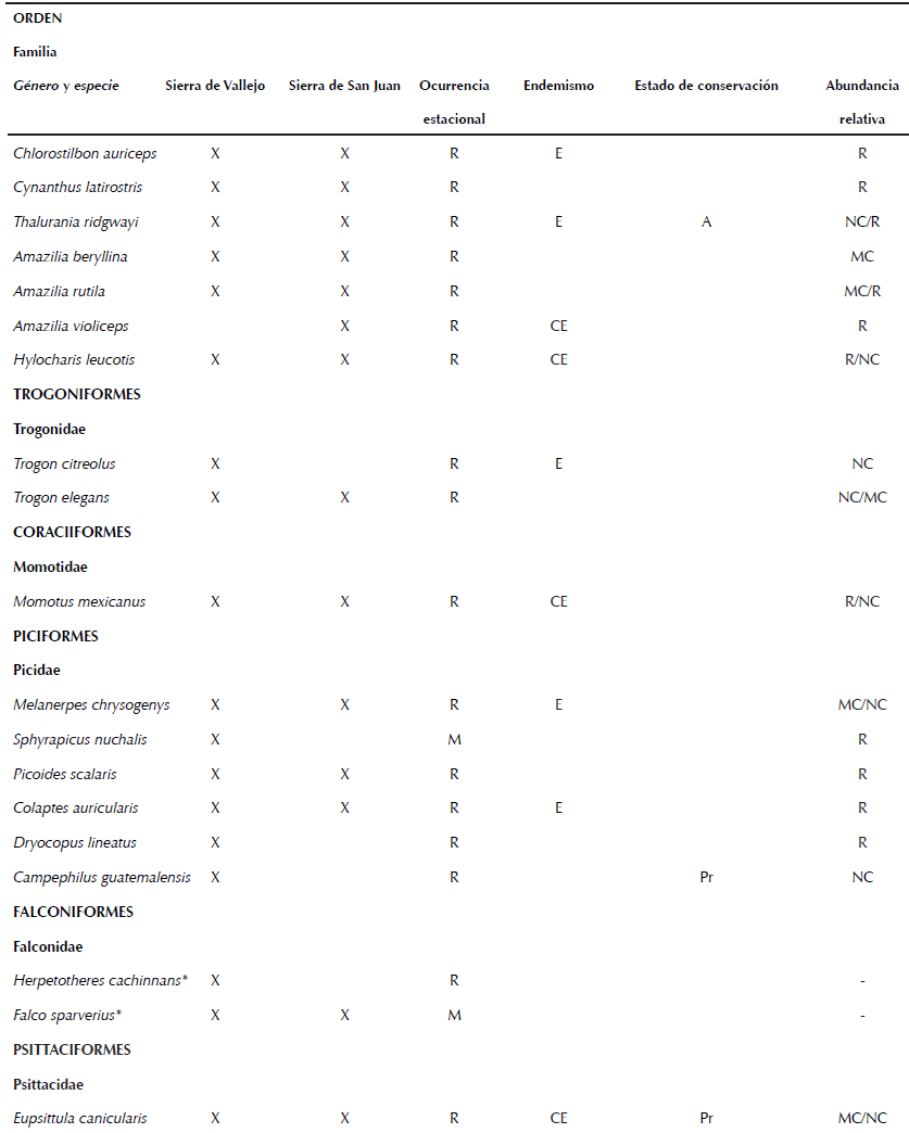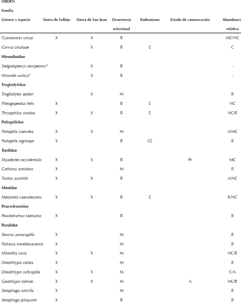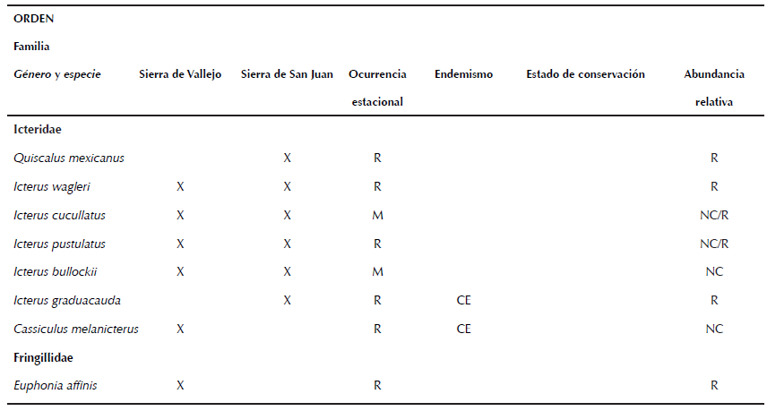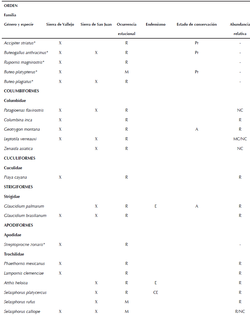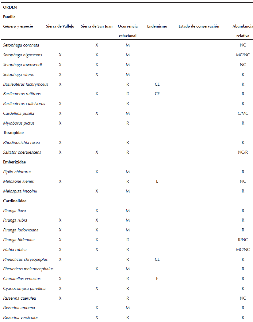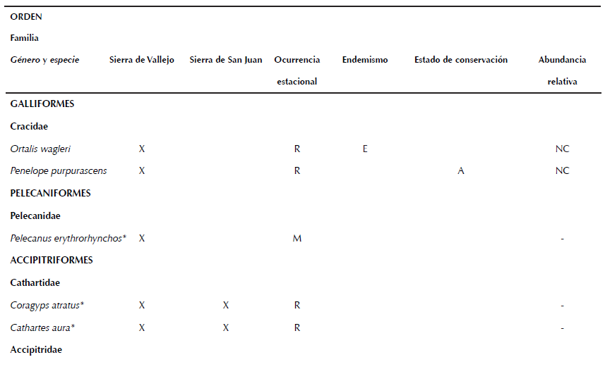 Abundancia relativa: A Abundante, C Común, MC Medianamente común, NC No común, R Rara. Cuando la abundancia es diferente entre las áreas la(s) letra(s) sobre la diagonal se refiere(n) a Sierra de Vallejo/Sierra de San Juan.